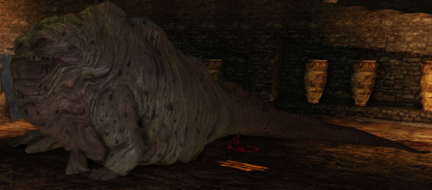This fat slug-like beast really stands out in this incredibly hard game. He tries to pounce on and bite you, but his attacks are too slow to be of any use. Just keep smacking him with your weapon and you'll be finished.