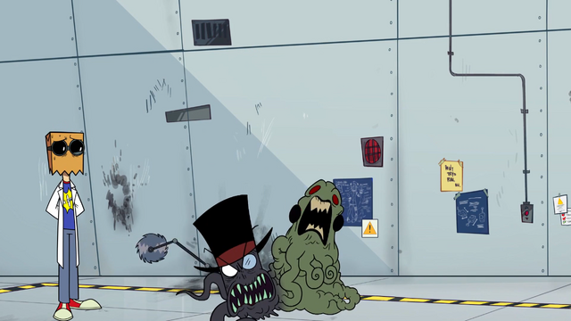 In the episode "Guide for an Evil Conquest, Dr. Flug shows his 5 points for successful villainy while review the Ben 10 villain Vilgax. Near the end, Dr. Flug gives Vilgax a Black Hat branded Omnitrix. When he tries to transform into Black Hat, he instead turns into a monstrous hybrid of the 2, the Black Hat half eats the Vilgax half and the whole abomination gets sucked right into the Omnitrix. Understandably, Flug responds by burning the device.